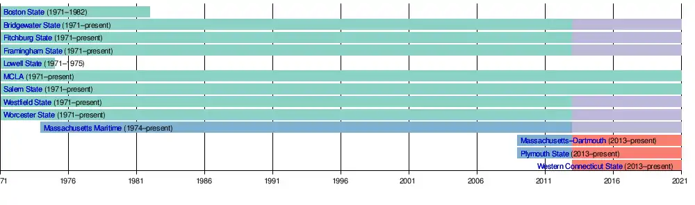 | Boston State College | Boston, Massachusetts | Warriors | 1872 | Public | ? | 1971 | 1982 | Merged into the University of Massachusetts–Boston |