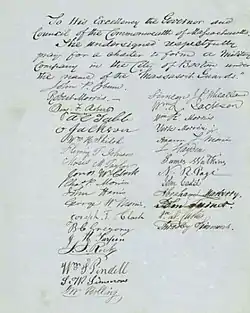 Morris and other advocates emphasized that blacks were native-born American citizens, unlike the immigrants who, at that time, were arriving in large numbers at the Port of Boston. Morris once remarked before the legislature's militia committee, "Some of the petitioners whom I have the honor to represent, can trace back their ancestry to a time long before an Englishman or any white foreigner stood upon American ground." William J. Watkins was more explicit: "All we ask is that you treat us as well as you do the Irish, German, Hungarian." Despite the appeal to nativism, which was on the rise in Massachusetts, their petitions were denied.[7] Eventually the Massasoit Guards gave up in frustration and disbanded.[6]