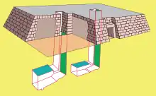 Inside the mastaba, the burial chambers were cut deep, into the bedrock, and were lined with wood.[10] A second hidden chamber called a serdab (سرداب), from the Persian word for "cellar",[11] was used to store anything that may have been considered essential for the comfort of the deceased in the afterlife, such as beer, grain, clothes and precious items.[12] The mastaba housed a statue of the deceased that was hidden within the masonry for its protection. High up the walls of the serdab were small openings that would allow the ba to leave and return to the body (represented by the statue); Ancient Egyptians believed the ba had to return to its body or it would die. These openings "were not meant for viewing the statue but rather for allowing the fragrance of burning incense, and possibly the spells spoken in rituals, to reach the statue".[13]