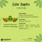 Catur Sagotra means four entities that still have a single root kinship, referring to the royal families who succeeded the Islamic Mataram dynasty. These kingdoms are Kasunanan Surakarta, Kasultanan Yogyakarta, Kadipaten Mangkunagaran, and Kadipaten Pakualaman.