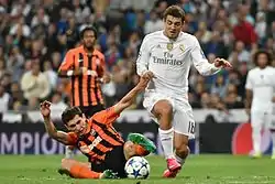 Four days after his presentation, he made his debut as a 70th-minute substitute for Isco as Real Madrid began the Liga season with a goalless draw at promoted Sporting de Gijón.[55] He scored his first goal in an 8–0 home win over Malmö FF on 8 December 2015.[56] On 3 January 2016, Kovačić received a straight red card in a 2–2 draw at Valencia for a foul on João Cancelo.[57] Until the end of his first season with Los Blancos, he made a total of 34 appearances. In the opening months of the season, he was used quite regularly by then Real Madrid manager Rafael Benítez, playing in almost every midfield position there is – sometimes central, sometimes wide, sometimes further forward. However, after Zinedine Zidane replaced Benítez in early January, Kovačić's appearances became increasingly infrequent. With the Frenchman preferring to use a very defined starting 11 whenever possible instead of the more specific-lineups-for-specific-opponents approach employed by his predecessor, there was little room for Kovačić. He made eight appearances and scored one goal en Real Madrid's route to the 2015–16 UEFA Champions League title.[58]