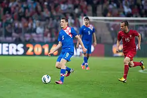 Kovačić appeared for the Croatian national team at various youth levels, debuting in May 2008 in an under-14 friendly match against Slovakia.[82] Since 2011, he was a regular member of the Croatia under-19 and under-21 teams. In August 2012, Kovačić received his first competitive call-up for the Croatian senior team match against Switzerland, but did not play because of injury.[83] Subsequently, he received a call up for 2014 FIFA World Cup qualification matches in March 2013. He made his senior debut in a qualification match against Serbia on 22 March 2013, playing as a central midfielder alongside Luka Modrić, instead of a regular team starter, Ognjen Vukojević.[84] Four days later, he played against Wales at Liberty Stadium, coming on as a second-half substitute in a 1–2 win. His third match of the campaign came in June, when Croatia faced Scotland in Zagreb and suffered a frustrating defeat as they were unable to score despite a string of good chances. By the end of the qualifiers, Kovačić made two more competitive appearances for Croatia, as Croatia scraped into the FIFA World Cup play-offs having taken only one point from their last four qualifiers. Although he didn't participate in the scoreless first leg of the play-off against Iceland in Reykjavík, Kovačić started the second and decisive leg between the two national teams in Zagreb, making an assist for the team's second goal as they reached the 2014 FIFA World Cup finals 2–0 on aggregate.[85]
