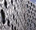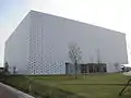 Towards the end of the 20th century, novel mathematical constructs such as fractal geometry and aperiodic tiling were seized upon by architects to provide interesting and attractive coverings for buildings.[4] In 1913, the Modernist architect Adolf Loos had declared that "Ornament is a crime",[103] influencing architectural thinking for the rest of the 20th century. In the 21st century, architects are again starting to explore the use of ornament. 21st century ornamentation is extremely diverse. Henning Larsen's 2011 Harpa Concert and Conference Centre, Reykjavik has what looks like a crystal wall of rock made of large blocks of glass.[103] Foreign Office Architects' 2010 Ravensbourne College, London is tessellated decoratively with 28,000 anodised aluminium tiles in red, white and brown, interlinking circular windows of differing sizes. The tessellation uses three types of tile, an equilateral triangle and two irregular pentagons.[104][105][lower-alpha 12] Kazumi Kudo's Kanazawa Umimirai Library creates a decorative grid made of small circular blocks of glass set into plain concrete walls.[103]