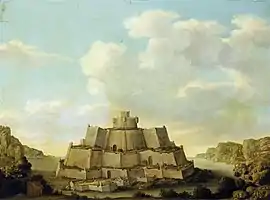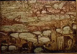 In The Destruction of Sodom and Gomorrah Dubus took the biblical episode from Genesis 19,1-29, which he depicted in the right bottom corner hidden under brittle, tattered masonry, as an opportunity to lead the viewer around among various bizarre forms. His observational stance could be called impressionistic.[10] In this work Dubus also simulated in the background a paesina, i.e. a marble stone which appears to depict a landscape. The artist thus imitated a piece of nature that imitated nature.[11]