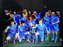 In 1955–56 Matlock finished bottom of Division One again.[8] The league was then reorganised, with the club placed in Division One North.[8] They won the division in 1959–60, also reaching the first round of the FA Cup, losing 1–0 to Crook Town in a replay.[9] After retaining the league title the following season,[8] the club moved up to the reformed Midland League, which they won the at the first attempt. They were Midland League champions again in 1968–69, subsequently joining the Northern Premier League.[9] They reached the first round of the FA Cup again in 1974–75, losing 4–1 at home to Blackburn. In the FA Trophy the club reached the final at Wembley Stadium, in which they defeated Scarborough 4–0 to win the trophy;[9] three Matlock players in the final were brothers, the only occasion on which three brothers have played for the same team in a Wembley final.[10] The following season saw them automatically qualify for the first round, but they lost 4–1 at Wigan Athletic.[9]