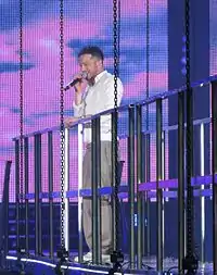 In 2010, Cardle auditioned for the seventh series of The X Factor in front of Simon Cowell, Cheryl Cole and Louis Walsh, singing Amy Winehouse's "You Know I'm No Good".[27] At the Bootcamp stage of the show he sang "The First Time Ever I Saw Your Face", a performance which prompted Simon Cowell to say "Why haven't we noticed him before?" and Louis Walsh to say "He's the biggest surprise of today for me!"[28] He was moved to the boys category when the age limit was raised to 28, making Dannii Minogue his mentor. Cardle was favourite to win from before the live shows until the end of the series, with some of the shortest odds the show had ever seen.[29] On the first live show he sang "When Love Takes Over" which received high praise from all four judges.[30] In week 5 he performed "The First Time Ever I Saw Your Face" again, which earned him the first standing ovation from all four judges of the series.[31][32] It remains his most viewed performance on YouTube with over 29 million views to date. In the semi-final he had to withdraw from a secret X Factor gig in London due to throat problems which saw him almost have to miss the show that weekend.[33] In the final he performed a duet with Rihanna.