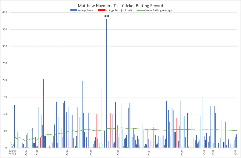 Hayden holds the record for the highest score made by an Australian batsman in Tests (380). This is also the record for the highest individual test score by an opening batsman in Tests.[2] His innings of 201 against India in Chennai remains the 2nd highest score by an Australian in India. He formed one of the most prolific opening partnerships in world Test cricket for Australia with Justin Langer,[3] and in ODI cricket with Adam Gilchrist. Upon his retirement, in January 2009, Hayden's Test average was 50.7; he had scored the second most runs in Test cricket by an opening batsman; and was equal 6th (with Jacques Kallis) on the all-time list for Test centuries.