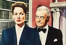 In 1949, O'Hara played what she described as a "frustrated talent manager who shoots her star client in a jealous rage" opposite Melvyn Douglas in A Woman's Secret. She only agreed to appear in the production to meet the one-picture-a-year contractual obligation to RKO.[108] It was a box office flop and at the time not well received critically—director Nicholas Ray himself was dissatisfied with it.[109] She next had a role as a wealthy widow who falls in love with an alcoholic artist (Dana Andrews) in the Victorian melodrama The Forbidden Street,[110] which was shot at Shepperton Studios in London.[110] O'Hara felt that her performance was poor and admitted that she did not have her heart set on the film.[111] After the poorly received comedy Father Was a Fullback, [112] dismissed by Picturegoer magazine as an "unhappy mixture of Freud and football",[113] she starred in her first film with Universal Pictures,[114] the escapist adventure, Bagdad, portraying Princess Marjan.[115] The film was shot on location in the Alabama Hills of Lone Pine, California.[115] O'Hara noted that the film earned a tremendous amount of money for Universal, and its success led to Universal buying into her RKO contract.[114] Malone wrote that she sings, dances, fights, and loves in a tale of derring-do that ticks all the requisite boxes for an opulent history lesson", adding that "when it came to dexterity in action, O'Hara was a nonpareil".[116]