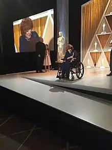 In 1985 she was awarded the Career Achievement Award from the American Cinema Foundation.[274] O'Hara also became the first woman to win the John F. Kennedy Memorial Award for "Outstanding American of Irish Descent for Service to God and Country".[263] For her contributions to the motion picture industry, O'Hara has a star on the Hollywood Walk of Fame at 7004 Hollywood Blvd. In 1993, she was inducted into the Western Performers Hall of Fame at the National Cowboy & Western Heritage Museum in Oklahoma City, Oklahoma.[275] She was awarded the Golden Boot Award.[276]