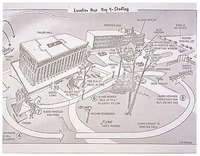 - At 12:24 in the afternoon, four college students were shot and killed at Ohio's Kent State University, and nine others wounded by Ohio National Guardsmen, during a protest against the incursion into Cambodia.[23][24] Around noon, the Guardsmen fired tear gas into the crowd of 500 protesters, and some demonstrators threw rocks and threw back tear gas grenades. According to an eyewitness, one student threw a rock as the Guardsmen were turning away to leave the area and "one section of the Guard turned around and fired and then all the Guardsmen turned around and fired."[25] A later investigation determined that about 28 members of the Guard had fired their rifles, with 61 shots in the space of 13 seconds.[26][27] Eight National Guardsmen would be indicted in 1973 for the shooting, and would be acquitted. On May 1, 2007, a student's audio of the recording would be released that included the moment that the command was given to prepare to fire.[28] After the killings, several eyewitnesses said that the initial gunshots, that might have led the Guardsmen to believe they were under attack, had been an ill-timed warning shot fired by a 21-year-old student who was working as an informant for the campus police and for the FBI.[29]