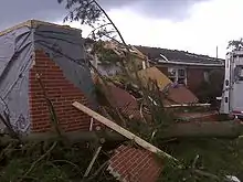 The initial squall line formed in central Kansas, to the northwest of Hutchinson.[14] In Hutchinson, several airplanes were flipped at a local airport, and 21,000 people were left without power. A woman was killed in New Albany, Kansas, when her mobile home was blown forty feet off of its foundation.[8] National Weather Service survey teams found that winds reached 120 mph (190 km/h) in the area, which also resulted in the destruction of a church and the town's post office, in addition to damaging several homes.[8][14] A total of 130 buildings were damaged in Cherokee, Kansas, including a high school gymnasium. Schools in several counties closed for the day, and a twenty-mile stretch of the Kansas Turnpike was closed for an hour due to flooding.[8]