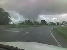 The May 2009 Southern Midwest Derecho was an extreme progressive derecho and mesoscale convective vortex (MCV) event that struck southeastern Kansas, southern Missouri, and southwestern Illinois on May 8, 2009.[9][10] Thirty-nine tornadoes, including two of EF3 strength on the Enhanced Fujita Scale, were reported in addition to high non-tornadic winds associated with the derecho and MCV.[10] Due to the abnormal shape of the storm on radar and the extremely strong winds, many called this an "inland hurricane."[11][12] A new class of storm, the Super Derecho, has been used to describe this event after analysis in 2010.[13] Embedded supercells produced hail up to baseball size in southern Missouri, a rare event in a derecho.[2] A wind gust to 106 mph (171 km/h) was recorded by a backup anemometer at the Southern Illinois Airport after official National Weather Service equipment failed.[1]