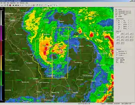 ![]() A screenshot from the Paducah, Kentucky, radar of the mesoscale convective vortex portion of the derecho near Carbondale, Illinois. This screenshot is from the approximate time the 106 mph (171 km/h) wind gust was recorded at the Southern Illinois Airport. | |