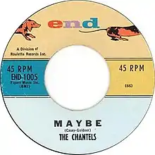 "Maybe" is a song with words and music originally credited to End Records owner George Goldner and "Casey". The co-writing credit was later transferred to Richard Barrett. Arlene Smith, lead singer of the Chantels, is believed to be an uncredited co-writer.[1] It was first recorded by the Chantels on October 16, 1957, in a doo-wop style with Barrett playing piano, and released in December 1957. It climbed the charts in January 1958, reaching No. 15 in the Billboard Hot 100 and No. 2 in the Billboard R&B chart. It was subsequently described as "arguably, the first true glimmering of the girl group sound".[2] Rolling Stone ranked it No. 199 on its list of The 500 Greatest Songs of All Time.[1] It was also included in Robert Christgau's "Basic Record Library" of 1950s and 1960s recordings, published in Christgau's Record Guide: Rock Albums of the Seventies (1981).[3]