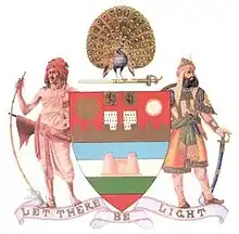 The coat of arms was composed from the design furnished by Lockwood Kipling, a former principal of the School of Arts, Lahore, and father of Rudyard Kipling.