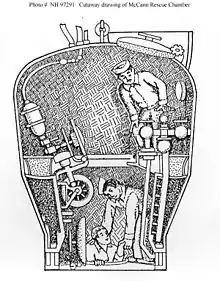 The rescue chamber was a pear shaped steel chamber, the big end uppermost, seven feet at the greatest diameter and ten feet high. It is divided into an upper closed compartment and a lower open compartment by a horizontal bulkhead which has a water tight hatch in its middle. Surrounding the lower compartment is a ballast tank of a capacity just equal to that of the lower compartment. Inside the lower compartment is a reel with 400 ft (120 m) of .5 in (13 mm) steel wire on it. The reel is operated by a shaft leading into the upper compartment. The shaft is rotated by an air motor. On the bottom edge of the lower compartment a rubber gasket is embedded into a circular groove, so that when the chamber is brought into contact with a flat surface (the hatch ring) a water tight joint may be effected with the application of pressure. Attached to the upper compartment is an air supply and an atmospheric exhaust hose, wire wound for strength. Also electric cables for telephone and light are attached. A wire pendant for hoisting and lowering is shackled into a pad-eye on top. This wire is also used for retrieving the chamber in case of emergency. The forward and after hatches of American submarines were fitted for attaching the rescue chamber. They have a flat doughnut shaped plate welded to the hatch coaming upon which the bottom of the chamber rests and a bail over the center of the hatch to which the haul down wire must be attached by the diver.[6]