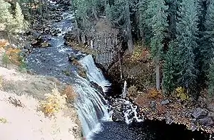 The McCloud River watershed drains 674 square miles (1,750 km2).[5] It rises from several spring-fed streams in Colby Meadows in the Cascades approximately 10 miles (16 km) southeast of Mount Shasta in Siskiyou County. It flows initially west, passing south of Mount Shasta and receiving streams that drain the southern slope of the peak. East of McCloud it forms a series of waterfalls which tumble over basaltic lava flows, known collectively as the McCloud River Falls or Falls of the McCloud River.