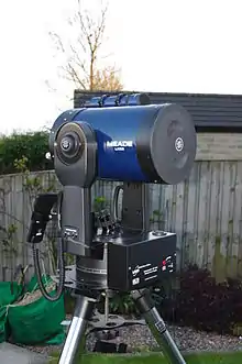 The Meade LX90 is a Schmidt-Cassegrain design of telescope made by Meade Instruments for the mid-priced (2000 USD circa 2008) commercial telescope market.[1][2] It uses a similar optical system to the bigger and more expensive Meade LX200[2]—although it lacks some useful functions like primary mirror locking. The LX90 telescopes were equipped with Autostar soon after its 1999 introduction by Meade instruments.[2] Optical apertures included in the product line included 8 (20 cm), 10 (25 cm) and 12 (30 cm) inches on a double tine fork mount and Autostar system.[1]