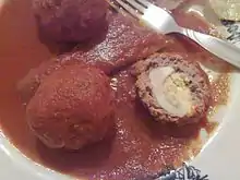 A meatball is ground meat rolled into a small ball, sometimes along with other ingredients, such as bread crumbs, minced onion, eggs, butter, and seasoning.[1] Meatballs are cooked by frying, baking, steaming, or braising in sauce. There are many types of meatballs using different types of meats and spices. The term is sometimes extended to meatless versions based on vegetables or fish; the latter are commonly known as fishballs.