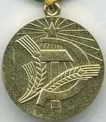 The Medal "For Transforming the Non-Black Earth of the RSFSR" (Russian: Медаль «За преобразование Нечерноземья РСФСР») was a civilian award of the Soviet Union established on September 30, 1977 by Decree of the Presidium of the Supreme Soviet of the USSR[1] to recognise three years of dedicated work in developing Soviet agriculture in the non-black earth regions of the Russian Soviet Federative Socialist Republic. The medal's statute was amended on July 18, 1980 by decree of the Presidium of the Supreme Soviet of the USSR № 2523-X.[2]
