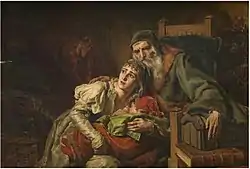During the Middle Ages, much art was created by Christians that depicted Jews in a fictional or stereotypical manner; the great majority of narrative religious Medieval art depicted events from the Bible, where the majority of persons shown had been Jewish. But the extent to which this was emphasized in their depictions varied greatly. Some of this art was based on preconceived notions about how Jews dressed or looked, as well as the “sinning” acts which Christians believed that they committed.[23] Visual art in particular expressed these ideas with a clear polemic edge. On the Westlettner of the Naumberg Cathedral, 13 of the 31 figures featured on the original set of reliefs are Jewish, clearly demarcated as such by their Jewish hats. As with much other medieval art of the Jews,[24] many of the 13 are depicted as in some way being complicit or directly aiding the Crucifixion of Christ, furthering the charge of Jewish deicide. With that in mind, however, some scholars argue that Naumberg's reliefs are unusually not anti-Jewish for their time period in their portrayal of the Jews, as not all of them are sculpted as unambiguously evil or malicious.[25] Comparing that to the caricatures in the west facade of the abbey church of St-Gilles-du-Gard, Naumberg's images do seem relatively tame. Here, Jews are displayed in some of the most typical anti-Jewish iconography of the time, with protruding jaws and hooked noses. Their haggardly, poor appearance is contrasted with the non-Jews of the image, including Roman guards, who are presented with a degree of fashion and status through their capes and typical tunics and similar attire.[25] Another iconic symbol of this era was Ecclesia and Synagoga, a pair of statues personifying the Christian Church (Ecclesia) next to her predecessor, the Nation of Israel (synagoga). The latter was often displayed blindfolded and carrying a tablet of the law sliping from her hand, sometimes also bearing a broken staff, whereas Ecclesia was standing upright with a crowned head, a chalice and a staff adorned with the cross.[26] This was often as a result of a misinterpretation of the Christian doctrine of Supersessionism involving a replacement of the "old" covenant given to Moses by the "new" covenant of Christ, which medieval Christians took to mean that the Jews had fallen out of God's favour.