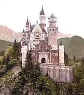 By the late nineteenth century pseudo-medieval symbols were the currency of European monarchical state propaganda. German emperors dressed up in and proudly displayed medieval costumes in public, and they rebuilt the great medieval castle and spiritual home of the Teutonic Order at Marienburg.[36] Ludwig II of Bavaria built a fairy-tale castle at Neuschwanstein and decorated it with scenes from Wagner's operas, another major Romantic image maker of the Middle Ages.[37] The same imagery would be used in Nazi Germany in the mid-twentieth century to promote German national identity with plans for extensive building in the medieval style and attempts to revive the virtues of the Teutonic knights, Charlemagne and the Round Table.[38]