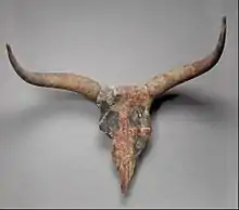 In the archaeological record, a culture known as the Pan-Grave Culture[3] is generally considered by experts to represent the Medjay.[4][5] This culture is named for its distinctive circular graves, found throughout Lower Nubia and Upper Egypt, which date to the late Middle Kingdom and Second Intermediate Period (1800-1550 BCE).[4][5] The sudden appearance of these graves in the Nile Valley suggests that they represent an immigrant population, while the presence of Nerita shells in many of them suggests their occupants came from the Eastern Desert between the Nile and the Red Sea.[4] Other objects commonly found in these graves include the painted skulls of various horned animals, which are found either arranged in a circle around the burial pit or placed in separate offering pits.[4]