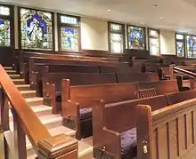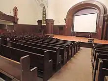In the same vein as the exterior of the meeting house, the interior of the hallowed space is also plain.[3] The meeting space has a circular arrangement: all the seats surround the center platform in a radial fashion.[3] The center platform, itself, also is different from other religious halls because the platform is barely above the seats, indicating that the speaker, physically and figuratively, comes from where the audience sits, and is not separate and apart from the people.[3] Moreover, the simplicity of the design translates into the details of the exterior, from the lack of finishing on the wood to the undecorated walls.[3] However, like the exterior, the interior is not entirely plain and undecorated: Inside the meeting house, there is a stained-glass window designed by Louis le Vaillant.[3] There are also other stained-glass windows, namely the ones that face out onto Central Park West, which are the most visible to the public.[2]