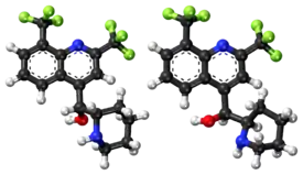 Mefloquine is a chiral molecule with two asymmetric carbon centres, which means it has four different stereoisomers. The drug is currently manufactured and sold as a racemate of the (R,S)- and (S,R)-enantiomers by Hoffman-LaRoche, a Swiss pharmaceutical company. Essentially, it is two drugs in one. Plasma concentrations of the (–)-enantiomer are significantly higher than those for the (+)-enantiomer, and the pharmacokinetics between the two enantiomers are significantly different. The (+)-enantiomer has a shorter half-life than the (–)-enantiomer.[12]
