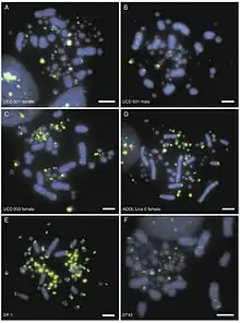 - Rodrigue KL, May BP, Famula TR, Delany ME (2005). "Meiotic instability of chicken ultra-long telomeres and mapping of a 2.8 megabase array to the W-sex chromosome". Chromosome Research. 13 (6): 581–91. doi:10.1007/s10577-005-0984-7. PMID 16170623.
