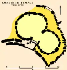 The centre of the façades is usually interrupted by an entrance doorway forming a trilithon, a pair of orthostats surmounted by a massive lintel slab.[31][32] Further trilithons form a passage, which is always paved in stone. This in turn opens onto an open space, which then gives way to the next element, a pair of D-shaped chambers, usually referred to as 'apses', opening on both sides of the passage. The space between the apses' walls and the external boundary wall is usually filled with loose stones and earth, sometimes containing cultural debris including pottery shards.[33]