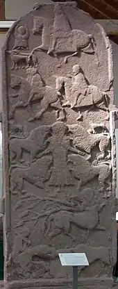 Meigle 3 dates to the 9th century AD.[21] One side has a cross, with a part of a Pictish double-disc symbol to the left, below the arm.[22] On the other is inscribed a mounted warrior wearing a sword below his cape, the scabbard tipped with a chape.[21] The warrior is seated on a striped saddle cloth and carries a spear in his right hand.[23] Meigle 3 is a low gravestone and the warrior may be a portrait of the deceased person.[22] The stone was cut shorter at least twice in antiquity, its original height may have been 0.6 metres (24 in).[22]
