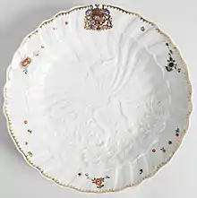 Initially relatively small tea and coffee services were the most produced, but from the 1730s large armorial porcelain dinner services began to be made, initially for Augustus, but then other buyers in Germany and abroad.[19] They also became used for diplomatic gifts. Maria Amalia of Saxony, granddaughter of Augustus, married the King of the Three Sicilies, later Charles III of Spain, and her dowry is said to have included 17 Meissen table services, inspiring the couple to found the Capodimonte porcelain factoruy in Naples.[20]