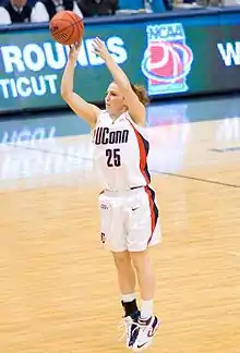 In her senior season, Thomas scored her 1,000th career point against the Virginia Cavaliers on December 5, 2007, in a 75-45 UConn win.[3] Nine games later, her season was cut short due to an ACL injury suffered against Syracuse on January 15, 2008. On January 21, 2008, against the University of North Carolina Tar Heels, Thomas was honored with her 1,000th point ball in front of a sold-out crowd at Gampel Pavilion.[4] While sidelined with the injury during her senior year she wrote in a diary every day, which was later published as a book titled Heart Of A Husky.[5] She finished her UConn career with 1,098 points, and is in the school's Top 5 in total 3pt FG's made with 224.