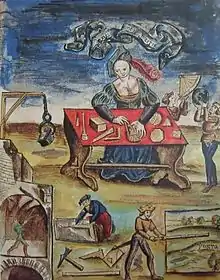 Agrippa defined three types of melancholic genius in his De occulta philosophia.[47] The first, melancholia imaginativa, affected artists, whose imaginative faculty was considered stronger than their reason (compared with, e.g., scientists) or intuitive mind (e.g., theologians). Dürer might have been referring to this first type of melancholia, the artist's, by the "I" in the title. Melancholia was thought to attract daemons that produced bouts of frenzy and ecstasy in the afflicted, lifting the mind toward genius.[6] In Panofsky's summary, the imaginative melancholic, the subject of Dürer's print, "typifies the first, or least exalted, form of human ingenuity. She can invent and build, and she can think ... but she has no access to the metaphysical world.... [She] belongs in fact to those who 'cannot extend their thought beyond the limits of space.' Hers is the inertia of a being which renounces what it could reach because it cannot reach for what it longs."[13] Dürer's personification of melancholia is of "a being to whom her allotted realm seems intolerably restricted—of a being whose thoughts 'have reached the limit'".[48] Melencolia I portrays a state of lost inspiration: the figure is "surrounded by the instruments of creative work, but sadly brooding with a feeling that she is achieving nothing."[49]