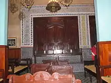 Most of the synagogues in the Mellah were merely pre-existing rooms within private residences which were converted by the owners into places of worship and sustained by member donations. As a result, almost everyone lived within a few steps of a synagogue, but very few synagogues were supported through public funding.[6] A few of them, however, were larger and were decorated with zellij mosaic tiles, carved stucco, and painted wooden ceilings, typically using much of the same decorative repertoires as Islamic architecture elsewhere in the city.[6][9]