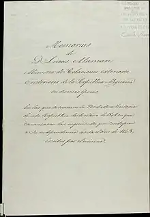 The handwritten document Memorias, la verdadera historia de esta república desde el año 1808 was written by Lucas Alamán, minister of foreign and interior affairs of the Mexican Republic. The document sheds light on the path of the republic during the year 1808, and the circumstances that led to its independence in 1823.[1]