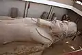 Also found were vestiges attesting to the architectural focus of this time. A large granite offering table on behalf of Amenemhat I mentioned the erection by the king of a shrine to the god Ptah, master of Truth.[25] Other blocks registered in the name of Amenemhat II were found to be used as foundations for large monoliths preceding the pylons of Rameses II. These kings were also known to have ordered mining expeditions, raids, or military campaigns beyond the borders, erecting monuments or statues to the consecration of deities, evinced by a panel recording official acts of the royal court during this time. In the ruins of the Temple of Ptah, a block in the name of Senusret II bears an inscription indicating an architectural commission as a gift to the deities of Memphis.[26] Moreover, many statues found at the site, later restored by the New Kingdom kings, are attributed to kings of the Twelfth Dynasty. Examples include the two stone giants that have been recovered amidst the temple ruins, which were later restored under the name of Rameses II.[27]