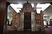 It preserves pre-Islamic architectural forms such as old Javanese split doorways, ancient Hindu-Buddhist influenced Majapahit-style red brickwork, and a three-tired pyramidal roof.[2] The most unusual feature is the brick minaret on which a pavilion shelters a large skin drum (bedug) which is used to summon the faithful to prayer instead of the more common muezzin. Whereas a bedug normally hangs under the eaves of a mosque veranda, in the Kudus Mosque it sits in a tower like a Balinese Hindu temple kul-kul or signal drum used to warn of impending attack, fire, or communal event. No other mosque in Java is known to have a drum tower of this type.[3]