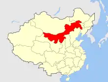 Mengjiang (Mengkiang), also known in English as Mongol Border Land[5] or the Mengjiang United Autonomous Government, was an autonomous area in Inner Mongolia, formed in 1939 as a puppet state of the Empire of Japan, then from 1940 being under the nominal sovereignty of the Reorganized National Government of the Republic of China (which was itself a puppet state). It consisted of the previously Chinese provinces of Chahar and Suiyuan,[6] corresponding to the central part of modern Inner Mongolia. It has also been called Mongukuo[7] or Mengguguo (or Mengkukuo; Chinese: 蒙古國) (in analogy to Manchukuo, another Japanese puppet state in Manchuria). The capital was Kalgan, from where it was ruled by the Mongol nobleman Prince Demchugdongrub. The territory returned to Chinese control after the defeat of the Japanese Empire in 1945.