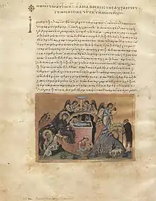 The Menologion of Basil II (also called Menologium of Basil II, Menology of Basil II) is an illuminated manuscript designed as a church calendar or Eastern Orthodox Church service book (menologion) that was compiled c. 1000 AD, for the Byzantine Emperor Basil II (r. 976–1025). It contains a synaxarion, a short collection of saints' lives, compiled at Constantinople for liturgical use, and around 430 miniature paintings by eight different artists. It was unusual for a menologion from that era to be so richly painted. It currently resides in the Vatican Library (Ms. Vat. gr. 1613).[1][2] A full facsimile was produced in 1907.[3]