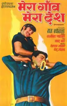 Mera Gaon Mera Desh (transl. My village, my country) is a 1971 Indian action drama film, directed by Raj Khosla, written by Akhtar Romani, and starring Dharmendra in the lead role and Vinod Khanna as the villain. It was a box office success.[1] The film contains many hit songs including: "Apni Prem Kahaniyan", "Aaya Aaya Atariya Pe Koi Chor", "Sona Lai Ja Re", "Kuch Kehta Hai Yeh Saawan" and "Maar Diya Jaye Dil Chhod Diya Jaye". The film was remade in Telugu as Manchi Babayi.