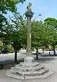 Some mercat crosses of today are replicas from the Victorian period, as at Dunfermline and Scone, though they often incorporate one or more original elements, particularly the shaft or a section thereof. Some crosses, as at Linlithgow and St Andrews, were replaced with public drinking fountains substituting for older, demolished crosses, and some were adapted as war memorials after the Great War of 1914–1918. A war memorial may incorporate a part of the original cross, as at Renfrew or Bowden, or have been built deliberately in the style of a mercat cross, as at Lauder and Moffat. The war memorials at Abernethy, North Berwick and Portree also closely resemble mercat crosses and are known as such. The last, of course, lies geographically well outside the historic area of Scottish Lowland burghs.[7] Another example of what might be termed an imitation cross is the war memorial at Dalmeny. It provides the village with a customary focal point and gives the impression that it is much older than its 19th-century origin, but is not indicative of a historical market.
