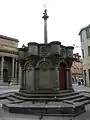The earliest documentary reference occurs in the reign of William the Lion (1165–1214), when it was decreed that "all merchandises sal be presentit at the mercat and mercat croce of burghis".[2] Early town crosses may have continued the tradition of church crosses used to mark consecrated land or sanctuary boundaries, and functioned similarly to early ecclesiastical crosses, from before the building of stone churches, in marking a communal gathering place. They are thought to have been originally pillars of wood, possibly placed on stone bases, changing to stone pillars in later centuries.[3] Some, as at Inverkeithing, incorporate sundials (the pillar of each cross itself acts as a primitive sundial).