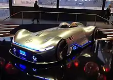The EQ Silver Arrow was unveiled at the IAA in Frankfurt in 2019, intended as a futuristic electric racing vehicle concept with an intended top speed of over 400 km/h. It features a unique body style reminiscent of the 1950s and 1960s era Mercedes sports coupes and features a single center seat with a front visor for the driver. It also features a front fender LED panel that displays motion lighting.