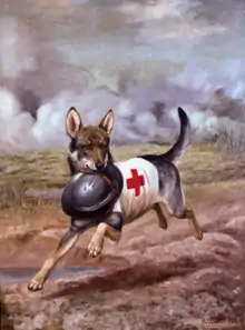 A mercy dog (also known as an ambulance dog, Red Cross dog, or casualty dog) was a dog that served in a paramedical role in the military, most notably during World War I. They were often sent out after large battles, where they would seek out wounded soldiers; and trench warfare suited their use. They carried first-aid supplies that could then be used by wounded soldiers and comforted dying soldiers who were mortally wounded. They were also trained to guide combat medics to soldiers who required extensive care. Many mercy dogs were trained by national Red Cross societies to serve the country in which the specific society operated. The German army called such dogs medical dogs. As many as 20,000 dogs are estimated to have served as mercy dogs in World War I and World War II, and they have been credited with saving thousands of lives. They would later go on to be used in the Korean War by the United States.