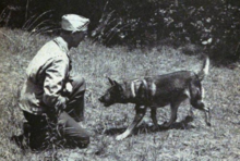 The United States Army utilized a casualty dog program during the Korean War to find wounded soldiers. German Shepherds were used for the work, which consisted of searching for a soldier and bringing their handler to them. The dogs were trained at Fort Riley, Kansas.[27]
