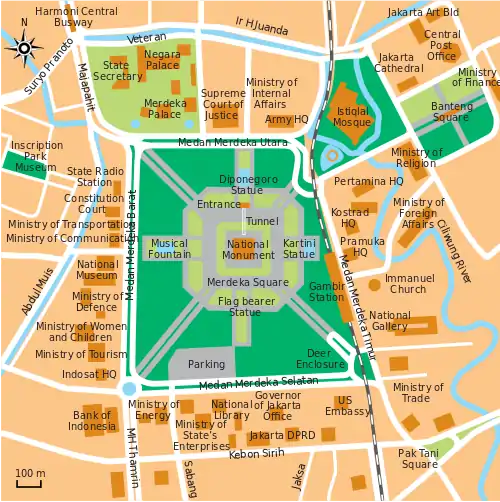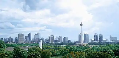It is surrounded by important government buildings such as the Merdeka Palace,[8] the National Museum, the National Library, Jakarta City Hall, Istiqlal Mosque, the Supreme Court and various governmental ministries.[6] During the colonial Dutch East Indies era the square was called Koningsplein (King's square).[9]