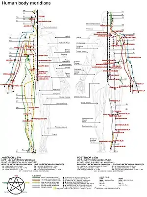 The meridian system (simplified Chinese: 经络; traditional Chinese: 經絡; pinyin: jīngluò, also called channel network) is a concept in traditional Chinese medicine (TCM). Meridians are paths through which the life-energy known as "qi" flows.[1]