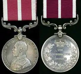 The Meritorious Service Medal was adopted by the Union as the Meritorious Service Medal (South Africa) in 1914, but unlike the earlier Meritorious Service Medal (Cape of Good Hope) and Meritorious Service Medal (Natal), the name of the country was not inscribed on this medal's reverse. Instead, the South African medal is identical to the United Kingdom's Meritorious Service Medal, but with a ribbon exclusive to South Africa.[1][2]